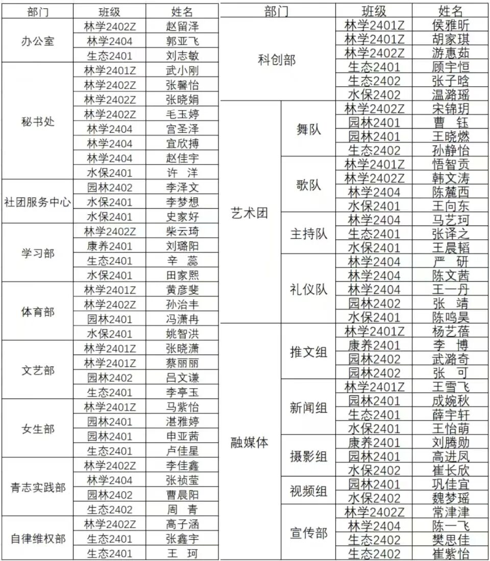 根据《山西农业大学林学院2025届学生分会换届通知》要求,本着公平、公正、公开的原则,林学院2025届学生组织各部门负责人及大学生艺术团负责人名单公示如下: