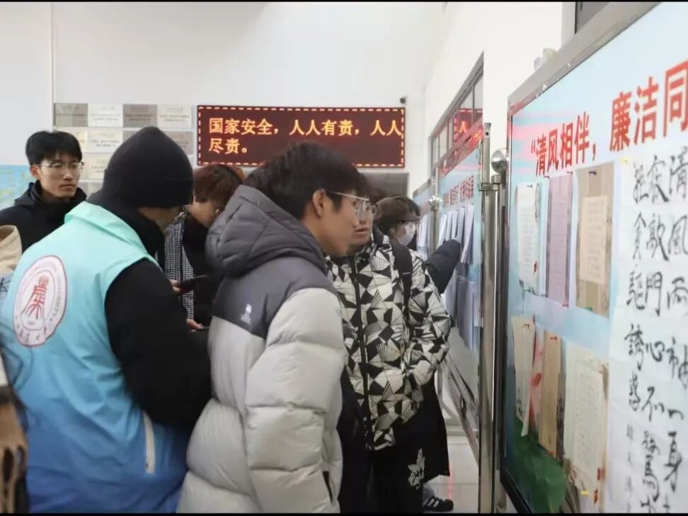 本次展览形式多样,汇集了电子宣传海报、书法绘画、主题征文及短视频等作品。步入展厅,清风正气扑面而来。展出的作品主题鲜明,风格各异,既有对清廉操守的深情礼赞,也有对贪污腐败的无情鞭挞;既有对传统廉洁文化的深刻挖掘,也有对新时代廉洁精神的生动诠释。同学们在作品前驻足观看,交流感悟,并为心仪的作品投票,最后在主题横幅上郑重签名留念。