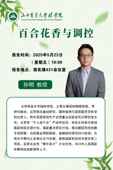 孙明教授在园林植物领域造诣深厚,主要从事园林植物资源、育种与栽培及应用基础研究,现任园林植物与观赏园艺学科学科负责人、林木资源高效生产全国重点实验室花卉研究室主任,同时担任北京市“千人进千企”产业特派员,兼具扎实的科研功底与丰富的产业实践经验。